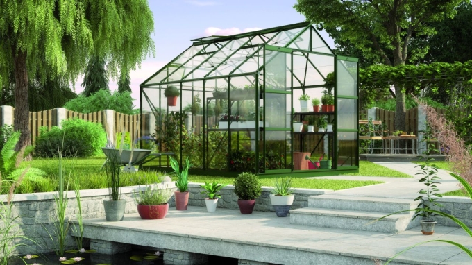 Freiraum zur Entfaltung: für hoch gewachsene Pflanzen. Gärtner haben an dem Uranus viel Freude, weil genug Platz für beide da ist. Das eigene Gewächshaus – der Traum eines jeden Pflanzenliebhabers.Das Uranus ist ein Modell für den fortgeschrittenen Gärtner. Es ist in vier verschiedenen Größen mit den Grundflächen von 6,7 bis 11,5 m2 und in drei Farben erhältlich: Aluminium eloxiert, Smaragd oder Schwarz (pulverbeschichtet). Mit der außergewöhnlichen Firsthöhe von 246 cm und der Traufenhöhe von 151 cm bietet das Uranus auch hohen Pflanzen viel Raum. Bei der Verglasung kann zwischen Einscheibensicherheitsglas (ESG) in 3 mm Stärke und Hohlkammerplatten (HKP) gewählt werden. Die Hohlkammerplatten gibt es in einer Stärke von 4 und 6 mm. Sie bestehen aus UV-stabilisiertem Polycarbonat (PC). Die Dachfensterverglasung der Modelle mit HKP hat eine Stärke vom 4 mm. Hohlkammerplatten bieten durch ihre höhere Isoliereigenschaft mehr Vorteile und Funktionalität als Glas. Sie sind bruchsicherer und leichter. Die leicht milchige Oberfläche bricht das Licht, sodass meist kein Abschattieren notwendig ist. Einscheibensicherheitsglas garantiert stattdessen eine hohe Lichtdurchlässigkeit und besticht durch die „klassische“ Glasoptik. An sonnigen, heißen Tagen sollte das Glas jedoch abschattiert werden, um die Pflanzen vor Verbrennung zu schützen. Gehärtetes Glas bricht nicht scharfkantig und sorgt somit für mehr Sicherheit. Das Modell hat eine leichtgängige, kugelgelagerte Doppelschiebetür mit einer Breite von 122 cm und einer Höhe von 191 cm und ein kittloses Verglasungssystem mit rostfreien Glasfederklammern. Jedes Modell ist serienmäßig mit zwei oder vier Dachfenstern und Regenrinnen ausgestattet.