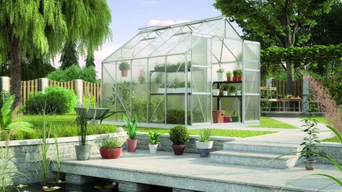 Freiraum zur Entfaltung: für hoch gewachsene Pflanzen. Gärtner haben an dem Uranus viel Freude, weil genug Platz für beide da ist. Das eigene Gewächshaus – der Traum eines jeden Pflanzenliebhabers.Das Uranus ist ein Modell für den fortgeschrittenen Gärtner. Es ist in vier verschiedenen Größen mit den Grundflächen von 6,7 bis 11,5 m2 und in drei Farben erhältlich: Aluminium eloxiert, Smaragd oder Schwarz (pulverbeschichtet). Mit der außergewöhnlichen Firsthöhe von 246 cm und der Traufenhöhe von 151 cm bietet das Uranus auch hohen Pflanzen viel Raum. Bei der Verglasung kann zwischen Einscheibensicherheitsglas (ESG) in 3 mm Stärke und Hohlkammerplatten (HKP) gewählt werden. Die Hohlkammerplatten gibt es in einer Stärke von 4 und 6 mm. Sie bestehen aus UV-stabilisiertem Polycarbonat (PC). Die Dachfensterverglasung der Modelle mit HKP hat eine Stärke vom 4 mm. Hohlkammerplatten bieten durch ihre höhere Isoliereigenschaft mehr Vorteile und Funktionalität als Glas. Sie sind bruchsicherer und leichter. Die leicht milchige Oberfläche bricht das Licht, sodass meist kein Abschattieren notwendig ist. Einscheibensicherheitsglas garantiert stattdessen eine hohe Lichtdurchlässigkeit und besticht durch die „klassische“ Glasoptik. An sonnigen, heißen Tagen sollte das Glas jedoch abschattiert werden, um die Pflanzen vor Verbrennung zu schützen. Gehärtetes Glas bricht nicht scharfkantig und sorgt somit für mehr Sicherheit. Das Modell hat eine leichtgängige, kugelgelagerte Doppelschiebetür mit einer Breite von 122 cm und einer Höhe von 191 cm und ein kittloses Verglasungssystem mit rostfreien Glasfederklammern. Jedes Modell ist serienmäßig mit zwei oder vier Dachfenstern und Regenrinnen ausgestattet.