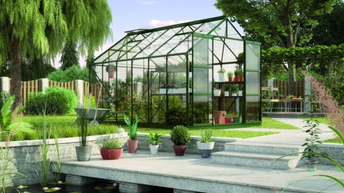 Freiraum zur Entfaltung: für hoch gewachsene Pflanzen. Gärtner haben an dem Uranus viel Freude, weil genug Platz für beide da ist. Das eigene Gewächshaus – der Traum eines jeden Pflanzenliebhabers.Das Uranus ist ein Modell für den fortgeschrittenen Gärtner. Es ist in vier verschiedenen Größen mit den Grundflächen von 6,7 bis 11,5 m2 und in drei Farben erhältlich: Aluminium eloxiert, Smaragd oder Schwarz (pulverbeschichtet). Mit der außergewöhnlichen Firsthöhe von 246 cm und der Traufenhöhe von 151 cm bietet das Uranus auch hohen Pflanzen viel Raum. Bei der Verglasung kann zwischen Einscheibensicherheitsglas (ESG) in 3 mm Stärke und Hohlkammerplatten (HKP) gewählt werden. Die Hohlkammerplatten gibt es in einer Stärke von 4 und 6 mm. Sie bestehen aus UV-stabilisiertem Polycarbonat (PC). Die Dachfensterverglasung der Modelle mit HKP hat eine Stärke vom 4 mm. Hohlkammerplatten bieten durch ihre höhere Isoliereigenschaft mehr Vorteile und Funktionalität als Glas. Sie sind bruchsicherer und leichter. Die leicht milchige Oberfläche bricht das Licht, sodass meist kein Abschattieren notwendig ist. Einscheibensicherheitsglas garantiert stattdessen eine hohe Lichtdurchlässigkeit und besticht durch die „klassische“ Glasoptik. An sonnigen, heißen Tagen sollte das Glas jedoch abschattiert werden, um die Pflanzen vor Verbrennung zu schützen. Gehärtetes Glas bricht nicht scharfkantig und sorgt somit für mehr Sicherheit. Das Modell hat eine leichtgängige, kugelgelagerte Doppelschiebetür mit einer Breite von 122 cm und einer Höhe von 191 cm und ein kittloses Verglasungssystem mit rostfreien Glasfederklammern. Jedes Modell ist serienmäßig mit zwei oder vier Dachfenstern und Regenrinnen ausgestattet.