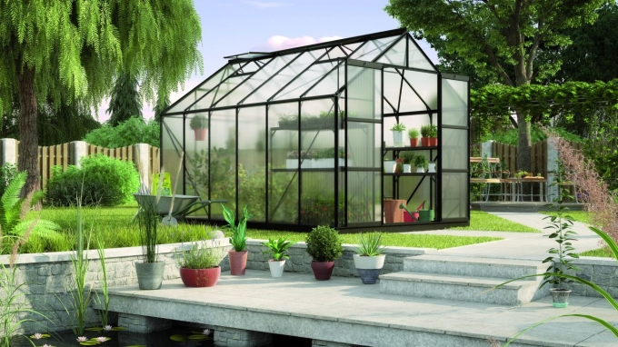 Freiraum zur Entfaltung: für hoch gewachsene Pflanzen. Gärtner haben an dem Uranus viel Freude, weil genug Platz für beide da ist. Das eigene Gewächshaus – der Traum eines jeden Pflanzenliebhabers.Das Uranus ist ein Modell für den fortgeschrittenen Gärtner. Es ist in vier verschiedenen Größen mit den Grundflächen von 6,7 bis 11,5 m2 und in drei Farben erhältlich: Aluminium eloxiert, Smaragd oder Schwarz (pulverbeschichtet). Mit der außergewöhnlichen Firsthöhe von 246 cm und der Traufenhöhe von 151 cm bietet das Uranus auch hohen Pflanzen viel Raum. Bei der Verglasung kann zwischen Einscheibensicherheitsglas (ESG) in 3 mm Stärke und Hohlkammerplatten (HKP) gewählt werden. Die Hohlkammerplatten gibt es in einer Stärke von 4 und 6 mm. Sie bestehen aus UV-stabilisiertem Polycarbonat (PC). Die Dachfensterverglasung der Modelle mit HKP hat eine Stärke vom 4 mm. Hohlkammerplatten bieten durch ihre höhere Isoliereigenschaft mehr Vorteile und Funktionalität als Glas. Sie sind bruchsicherer und leichter. Die leicht milchige Oberfläche bricht das Licht, sodass meist kein Abschattieren notwendig ist. Einscheibensicherheitsglas garantiert stattdessen eine hohe Lichtdurchlässigkeit und besticht durch die „klassische“ Glasoptik. An sonnigen, heißen Tagen sollte das Glas jedoch abschattiert werden, um die Pflanzen vor Verbrennung zu schützen. Gehärtetes Glas bricht nicht scharfkantig und sorgt somit für mehr Sicherheit. Das Modell hat eine leichtgängige, kugelgelagerte Doppelschiebetür mit einer Breite von 122 cm und einer Höhe von 191 cm und ein kittloses Verglasungssystem mit rostfreien Glasfederklammern. Jedes Modell ist serienmäßig mit zwei oder vier Dachfenstern und Regenrinnen ausgestattet.
