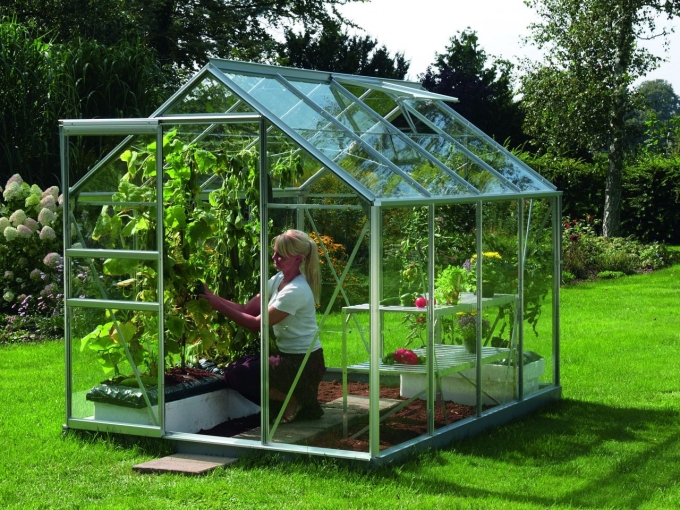 Venus ist Genussgärtnern pur: Unter dem Dach unseres beliebten Modells machen sich selbst Einsteiger mit wenig Aufwand viel Freude.Das Modell ist in vier verschiedenen Größen mit den Grundflächen von 2,5 bis 6,2 m2 und in zwei Farben erhältlich: Aluminium eloxiert oder Smaragd (pulverbeschichtet). Bei der Verglasung kann zwischen Hohlkammerplatten (HKP) und Einscheibensicherheitsglas (ESG) gewählt werden. Die Hohlkammerplatten gibt es in einer Stärke von 4 und 6 mm. Sie bestehen aus UV-stabilisiertem Polycarbonat (PC). Die Dachfensterverglasung hat bei HKP ca. 4 mm und bei ESG eine Stärke von ca. 3 mm. Hohlkammerplatten bieten durch ihre höhere Isoliereigenschaft mehr Vorteile und Funktionalität als Glas (ESG). Sie sind bruchsicher und leichter. Die leicht milchige Oberfläche bricht das Licht, sodass meist kein Abschattieren notwendig ist. Einscheibensicherheitsglas garantiert stattdessen eine hohe Lichtdurchlässigkeit und besticht durch die „klassische“ Glasoptik. An sonnigen, heißen Tagen sollte das Glas jedoch abschattiert werden, um die Pflanzen vor Verbrennung zu schützen. Das gehärtete Glas (ESG) kann nicht scharfkantig brechen und sorgt somit für mehr Sicherheit. Das Modell Venus hat eine leichtgängige, kugelgelagerte Schiebetür mit einer Breite von 61 cm und einer Höhe von 161 cm und ein kittloses Verglasungssystem mit rostfreien Glasfederklammern. Je nach Modell ist es serienmäßig mit ein oder zwei Dachfenstern ausgestattet. Die Regenrinnen gehören auch zur Standardausstattung. Für den ebenerdigen und rechtwinkligen Aufbau des Gewächshauses ist ein Fundamentrahmen aus verzinktem und farbbeschichtetem Stahlblech besonders hilfreich.