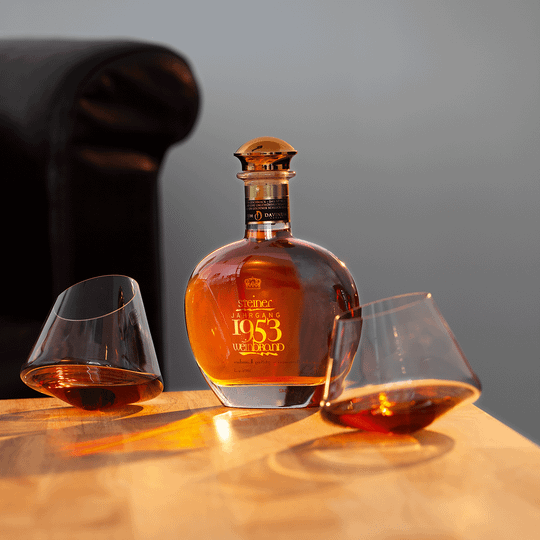 Dieser seltene Weinbrand wurde 1953 in der Steinerschen Brennerei Landau (Pfalz) aus erlesenen Charente-Weinen destilliert und bis zu seiner Reife 50 Jahre in Eichenholzfässern im dortigen Kellergewölbe gelagert. Selbst für einen Weinbrand ist das eine lange Reifezeit. Die limitierte Auflage des raren Edelbrandes zählt nur ein paar tausend Flaschen. Ein »Jahrhundertwein« bei einer Weinprobe in der französischen Charente (dem Cognac-Gebiet) hatte Steiner seinerzeit zu dem Weinbrand inspiriert - ein besonderer Tropfen, dazu aus demselben Jahr, in der Steiners Tochter geboren wurde. Lang ruhte und reifte der Edelbrand und entwickelte seinen außergewöhnlichen Charakter.