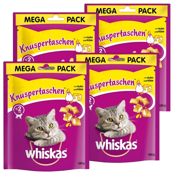 WHISKAS KNUSPERTASCHEN™ Beutel mit Huhn und Käse 180g - 4er SetWHISKAS  KNUSPERTASCHEN™ mit Huhn & Käse sind köstliche Katzenleckerlis mit einer knusprigen Hülle und einem unwiderstehlich cremigen Kern. Die Vielfalt unterschiedlicher Geschmacksrichtungen bietet eine großartige Möglichkeit, Ihrer Katze die Leckerlis zu geben, die sie liebt - mit weniger als 2 kcal pro Stück. Angereichert mit zusätzlichen Vitaminen und Mineralstoffen. WHISKAS® KNUSPERTASCHEN™ sind köstliche Katzenleckerlis mit einer knusprigen Hülle und einem unwiderstehlich cremigen Kern. Katzensnacks mit weniger als 2 kcal pro Leckerli. WHISKAS® Katzenleckerli sind angereichert mit Vitaminen und Mineralstoffen und enthalten keine künstlichen Aromastoffe. Die köstlichen Mahlzeiten und Katzensnacks von WHISKAS® enthalten alles, was Ihre Katze benötigt. WHISKAS® KNUSPERTASCHEN™ sind erhältlich mit Huhn & Käse, Lachs, Rind sowie mit Pute - denn Katzen lieben Abwechslung.WHISKAS® kennt Katzen. Deshalb verwenden wir leckere, nährstoffreiche Zutaten, denen Ihre Katze nicht widerstehen kann. Alle WHISKAS® Katzenfutter-Rezepturen werden mit großer Sorgfalt entwickelt, damit Ihre Katze genau das bekommt, was sie von Natur aus benötigt. Mit Katzenfutter und Snacks von WHISKAS® bleibt sie glücklich und gesund. Entwickelt von unseren Spezialisten in WALTHAM™, dem weltweit führenden Experten in Sachen Pflege und Ernährung von Haustieren. Jede einzelne Katzen-Mahlzeit ist vollwertig und ausgewogen. Verwöhnen Sie Ihre Katze mit dem Besten. Fütterungsempfehlung Fütterungsempfehlung: Füttern Sie bis zu 12 Stück täglich. Reduzieren Sie die Vollnahrung entsprechend. Innerhalb von 4 Wochen nach dem Öffnen verbrauchen. Innerhalb von 4 Wochen nach dem Öffnen verbrauchen. Ein Extranapf mit frischem Trinkwasser sollte immer bereitstehen.