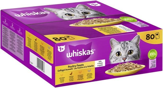 WHISKAS Portionsbeutel Multipack 1+ Geflügel Auswahl in Gelee 80 x 85gAlleinfuttermittel für ausgewachsene Katzen - Tiernahrung.Als Katzenliebhaber wissen wir, dass Schnurren das schönste Geräusch ist, das man hören kann. Deshalb kreieren wir mit großer Leidenschaft köstliche Mahlzeiten, die Katzen auf der ganzen Welt dazu bringen, mit schnurrender Begeisterung zu ihren Näpfen zu eilen. Jedes Gericht wird mit Liebe und Sorgfalt zubereitet und ist ernährungsphysiologisch ausgewogen, um dabei zu helfen, dass deine Katze alles hat, was sie braucht, um bei den Mahlzeiten zu schnurren – und nicht nur dann.Hochwertiges Katzenfutter in Gelee für Katzen ab 1 Jahr. Verwöhne deinen Liebling mit köstlichem Nassfutter mit Huhn und Pute in der Großpackung. Bereite deiner Katze eine Freude! Speziell zubereitet, um das natürlich Gute und Köstliche der hochwertigen Zutaten zu bewahren. Mit unseren Lieblingsmahlzeiten eilt deine Katze schneller als je zuvor zum Napf! Vom verspielten Kätzchen bis zur wunderbar älteren Katze enthalten unsere schmackhaften Rezepturen alles, was deine Katze für ihr Alter braucht. Zubereitet für zufriedenes Schurren...während der Mahlzeiten und darüber hinaus.Jede köstliche Rezeptur enthält 100% hochwertige Zutaten und deckt alle täglichen Bedürfnisse deiner 1+ Katze.Mit hochwertigem Protein zur Unterstützung starker Muskeln.Hergestellt mit Vitamin C zur Unterstützung der natürlichen Abwehrkräfte.Enthält Zink, unterstützt eine gesunde Haut & ein gesundes Fell.Wir sind bestrebt, unsere Umweltauswirkungen zu verringern. 85% unserer Fabriken in Europa nutzen Strom aus erneuerbaren Energien, und wir arbeiten daran, dies bis 2025 auf 100% zu erhöhen.