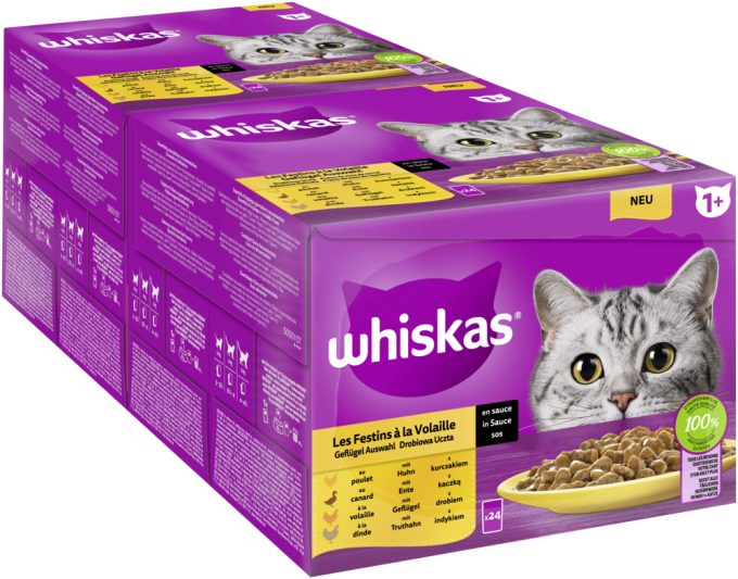 WHISKAS® Portionsbeutel Multipack Jumbo Pack 1+ Klassische Auswahl in Sauce mit Rind, mit Huhn, mit Lamm, mit Geflügel 80 x 85gHochwertiges Katzenfutter in Sauce für Katzen ab 1 Jahr. Verwöhne deinen Liebling mit köstlichem Nassfutter mit Rind und Lamm in der Großpackung. Bereite deiner Katze eine Freude! Speziell zubereitet, um das natürlich Gute und Köstliche der hochwertigen Zutaten zu bewahren. Mit unseren Lieblingsmahlzeiten eilt deine Katze schneller als je zuvor zum Napf! Vom verspielten Kätzchen bis zur wunderbar älteren Katze enthalten unsere schmackhaften Rezepturen alles, was deine Katze für ihr Alter braucht. Zubereitet für zufriedenes Schurren...während der Mahlzeiten und darüber hinaus.Als Katzenliebhaber wissen wir, dass Schnurren das schönste Geräusch ist, das man hören kann. Deshalb kreieren wir mit großer Leidenschaft köstliche Mahlzeiten, die Katzen auf der ganzen Welt dazu bringen, mit schnurrender Begeisterung zu ihren Näpfen zu eilen. Jedes Gericht wird mit Liebe und Sorgfalt zubereitet und ist ernährungsphysiologisch ausgewogen, um dabei zu helfen, dass deine Katze alles hat, was sie braucht, um bei den Mahlzeiten zu schnurren – und nicht nur dann. Jede köstliche Rezeptur enthält 100% hochwertige Zutaten und deckt alle täglichen Bedürfnisse deiner 1+ Katze. Mit hochwertigem Protein zur Unterstützung starker Muskeln. Hergestellt mit Vitamin C zur Unterstützung der natürlichen Abwehrkräfte. Enthält Zink, unterstützt eine gesunde Haut & ein gesundes Fell. Wir sind bestrebt, unsere Umweltauswirkungen zu verringern. 85% unserer Fabriken in Europa nutzen Strom aus erneuerbaren Energien, und wir arbeiten daran, dies bis 2025 auf 100% zu erhöhen.Fütterungsempfehlung:1 Portionsbeutel lässt sich durch 16 g WHISKAS® Trockennahrung ersetzen. Berücksichtigen Sie die Kalorien, die von Snacks stammen. Passen Sie die Fütterungsmenge den Bedürfnissen Ihrer Katze an. Wie Besuchen Sie unsere Website. Stellen Sie frisches Trinkwasser bereit. Bitte bei Zimmertemperatur servieren. Bitte beachten Sie die Fütterungstabelle auf der Verpackung für eine individuelle Anpassung für Ihr Tier.Zusammensetzung:Fleisch und tierische Nebenerzeugnisse (34%, u.a. 4% Huhn im Häppchen*), Getreide, pflanzliche Nebenerzeugnisse, Mineralstoffe, Zucker. *Häppchen machen 40% des Produkts aus. # mit Ente - Zusammensetzung: Fleisch und tierische Nebenerzeugnisse (34%, u.a. 4% Ente im Häppchen*), Getreide, pflanzliche Nebenerzeugnisse, Mineralstoffe, Zucker. *Häppchen machen 40% des Produkts aus. # mit Geflügel - Zusammensetzung: Fleisch und tierische Nebenerzeugnisse (34%, u.a. 4% Geflügel im Häppchen*), Getreide, pflanzliche Nebenerzeugnisse, Mineralstoffe, Zucker. *Häppchen machen 40% des Produkts aus. # mit Truthahn - Zusammensetzung: Fleisch und tierische Nebenerzeugnisse (34%, u.a. Truthahn 4% im Häppchen*), Getreide, pflanzliche Nebenerzeugnisse, Mineralstoffe, Zucker. *Häppchen machen 40% des Produkts aus.Analytische Bestandteile:Protein: 7.3; Fettgehalt: 4.0; anorganischer Stoff: 1.6; Rohfaser: 0.25; Feuchtigkeit: 84.5. Brennwert: 61 kcal/85 g.Zusatzstoffe:Vitamin C: 702 mg, Vitamin D₃: 200 IE, Taurin: 620 mg, Kupfer (Kupfer(II)-sulfat-Pentahydrat): 1.2 mg, Jod (Calciumjodat wasserfrei): 0.22 mg, Eisen (Eisen-(II)-sulfat-Monohydrat): 11.2 mg, Mangan (Mangan(II)-sulfat, Monohydrat): 2.2 mg, Zink (Zinksulfat Monohydrat): 16.2 mg / Sensorische Zusatzstoffe: Aromen.