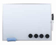 Whiteboard Magnettafel, 40 x 30cm, mit Alurahmen Egal ob für private oder berufliche Verwendung, unser Whiteboard hilft Ihnen bei der übersichtlichen Präsentation. Notizen, Termine, Mindmaps oder To-do-Listen können somit schnell visualisiert werden. Zusätzlich können Fotos, Pläne und Memozettel mit den gelieferten Magneten befestigt werden. Danach können nicht mehr benötigte Beschriftungen problemlos mit dem Schwamm abgewischt werden. Eigenschaften: -Befestigung von Notizen mit Hilfe von Magneten möglich -Schrift lässt sich einfach trocken oder feucht abwischen -Platzierung im Hoch- oder Querformat -Befestigung: leichte Montage mit 2 Wandanker an der Rückseite -Größe: 40x30cm -Gesamtdicke: ca. 7 mm -Gewicht: 0,645kg -Farbe: weiß -Inhalt: 1x Whiteboard, 1x Stift, 1x Schwamm, 4x Magnete