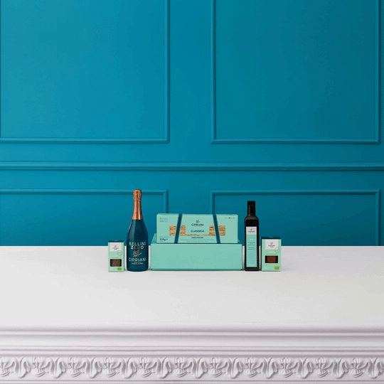 Neues von Cipriani: Die Geschenkbox »Dinner für Zwei in Downtown« ist eine kulinarische Reise durch Italien und Amerika und beinhaltet alles, was man für ein kleines exklusives Essen braucht. Verwandeln Sie Ihr Zuhause in ein Gourmet-Restaurant und gönnen Sie sich ein geschmackliches Erlebnis mit einer Auswahl von Produkten höchster Qualität, die sorgfältig ausgesucht wurden. Inhalt: 1 x Bellini Zero von Cipriani - der legendäre Cocktail aus Harry’s Bar, hier ohne jeglichen Alkohol; 1 x Cipriani-Ei-Tagliolini 250 g - zarte Nudeln auf Eibasis mit Bio-Zutaten - leicht rauh, exquisite Textur (Kochzeit 2 Minuten); 1 x feinstes Cipriani Bio-Olivenöl extra vergine 0,5 Liter, 1 x Bio-Pesto mit Basilikum 180 g, 1 x Bio Pastasauce Sansovina 340 g - die Tomatensauce ist mit Basilikum verfeinert und passt perfekt zu allen feinen Cipriani Eiernudeln oder zu Hartweizen Pasta. Das Olivenöl ergänzt das fertige Gericht. Ausgewählt aus einer Mischung traditioneller italienischer Sorten - Frantoio, Leccio del Corno, Coratina, Canino, Itrana, Biancolilla, Nocellara, Carolea - bietet dieses Öl ein einzigartig reiches und unverwechselbares Geschmacksprofil. Bellissimo!