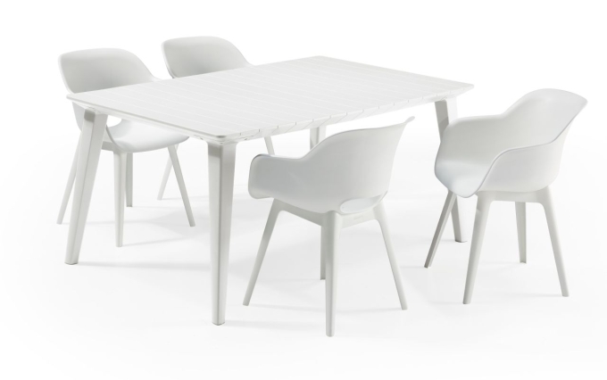 5-tlg. Dining Gruppe Split+Bari, bestehend aus: 4x Sessel + 1x Tisch. Hochwertiger Vollkunststoff-Sessel im Retro-Look. Perfekt geformte Sitzschale mit stabiler Gestell-Konstruktion. Hergestellt aus 100 % Polypropylen, daher absolut witterungsbeständig. Sitzschale und Gestell sind platzsparend verpackt und leicht montierbar. Der Tisch Bari ist auf das Wesentliche reduziert und bietet mit seiner stattlichen Länge viel Platz für große Tafelrunden. Der elegante Tisch besteht aus einem stabilen und robusten Vollkunststoff (100 % Polypropylen) und sorgt für eine hohe Standfestigkeit. Die Tischplatte besitzt in der Mitte ein praktisches, bei Bedarf abdeckbares Schirmloch. Der Tisch ist pflegeleicht, absolut wetterfest und U.V. beständig. Maße Sessel: Gesamtmaß BxTxH in cm: 57x56x80 / Sitzfläche BxT in cm: 40x42 / Sitzhöhe: 45 cm/ Höhe der Armlehne: 66 cm / Höhe der Rückenlehne: 37 cm; Maße Tisch: 157 x 98 cm / Tischhöhe: 74 cm