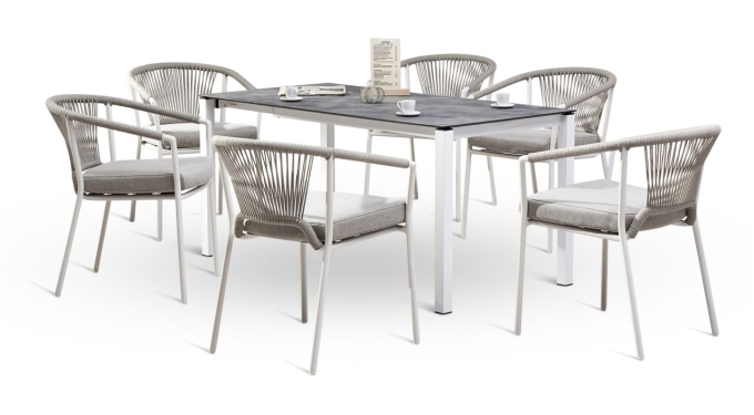 7-tlg. Dining Gruppe Matera/Palazzo 210 weiss, bestehend aus: 6x Stapelsessel + 1x Tisch. Korrosionsfreies, wetterfestes Aluminiumgestell daher leicht im Handling. Die Rope-Bespannung ist absolut witterungsbeständig und trocknet sehr schnell. Die Sessel sind platzsparend stapelbar. Den Ausziehtisch gibt es in zwei unterschiedlichen Größen und jeweils in zwei Farben. Das stabile, standfeste Stahl-Gestell ist wetterfest verzinkt und zusätzlich beschichtet. Die HPL-Platte ist unempfindlich und kratzfest in einer eleganten Cement-Optik. Dank der praktischen Führungsschienen kann der Tisch schnell und ohne Kraftaufwand ausgezogen werden und die Einlegeplatten praktisch unter der Tischplatte mit wenigen Handgriffen verstaut werden. Maße Sessel: Gesamtmaß: BxTxH in cm: 59x61x79 / Sitzfläche BxT in cm: 48x46 / Sitzhöhe: 50 cm / Höhe der Armlehne: 68 cm / Höhe der Rückenlehne: 36 cm; Maße Tisch:160/210x90cm / Tischhöhe: 75 cm