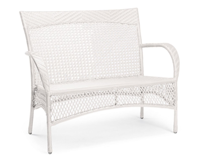 2-Sitzer Korbbank mit einem Kunstfadengeflecht sowie einem stabilem Aluminiumgestell. Im Gegensatz zum Naturmaterial ist diese Korbbank gegen alle Witterungseinflüsse beständig. Das lichtdurchflutete Flechtwerk gibt dem Körperdruck leicht nach, was den besonderen Sitzkomfort dieser Bank noch erhöht. Die unterschiedlichen Flechtarten betonen die Lebendigkeit des Designs. Eine ansprechende Gartenbank die nicht nur für draußen auf Grund ihrer wetter- und U.V.- Beständigkeit sondern auch für den Wintergarten oder den Wohnbereich bestens geeignet ist. Maße: Gesamtmaß BxTxH in cm: 114x66x95 / Sitzfläche BxT in cm: 98/91x45 / Sitzhöhe: 43 cm / Höhe der Armlehne: 67,5 / Höhe der Rückenlehne: 58 cm