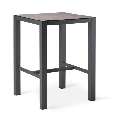 Moderner Bar-Tisch mit anthrazitfarbenem Gestell aus rostfreiem Aluminium. Daher leicht und unkompliziert im Handling. Die Tischplatte ist aus robustem HPL und absolut wetterfest. Ideal einsetzbar für Steh- und Sitzsituationen und flexibel als Einzelmöbel kombinierbar. Maße: quadratisch 80x80 cm / Tischhöhe: 109,5 cm