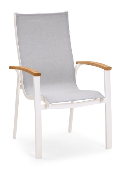 Der komfortable Gestellrahmen ist komplett aus Aluminium somit absolut korrosions- und witterungsfest und leicht im Handling. Das Gestell ist pulverbeschichtet und in zwei Farben erhältlich. Ergonomisch geformter Sitz und Rückenlehne mit atmungsaktiver Bespannung aus reißfestem Ergotex-Gewebe. Bequeme, breite Armlehnen aus edlem, witterungsbeständigem Teak-Holz. Der Sessel ist stapelbar. Maße: Gesamtmaß: BxTxH in cm: 64x68x102 / Sitzfläche BxT in cm: 47x45 / Sitzhöhe: 43 cm/ Höhe der Armlehne: 64 cm / Höhe der Rückenlehne: 65 cm