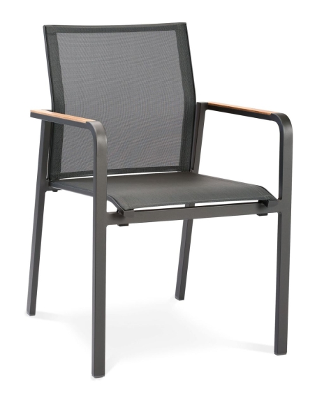 Moderner Stapelsessel mit einem Gestell aus rostfreiem Aluminium. Daher leicht, rostfrei und unkompliziert im Handling. Mit einer strapazierfähigen Oberflächenbespannung aus witterungsbeständigem Ergotex. Der ergonomische Knick der Rückenlehne ergibt ein sehr bequemes Sitzgefühl. Die Sessel sind platzsparend stapelbar und hervorragend für den Objektbereich geeignet. Die Armlehnenaufsätze sind aus hochwertigem, angenehmen Teakholz angefertigt. Maße: Gesamtmaß BxTxH in cm: 56x64x85 / Sitzhöhe: 45 cm / Sitzfläche: 44x50 cm / Höhe der Armlehne: 65 cm / Höhe der Rückenlehne: 43 cm