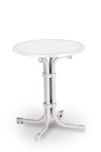 Die extrem strapazierfähige Werzalit-Tischplatte ist absolut wetterfest und pflegeleicht. Sie besitzt eine weiße Oberflächenmarmorierung und hat keine Kanten und Fugen. Die Platte ist kratzfest, hitzebeständig und belastbar. Das stabile und standfeste Stahlrohrgestell mit doppeltem Klappmechanismus und Sicherheitsbügel ist weiß pulverbeschichtet. Mit wenigen Handgriffen wird die Platte abgeklappt und das Fußgestell einfach seitlich eingeschwenkt. Dank der Niveauausgleichsschraube kann die optimale Standfestigkeit auf unebenem Boden eingestellt werden. rund 60 cm Ø / Tischhöhe: 72 cm