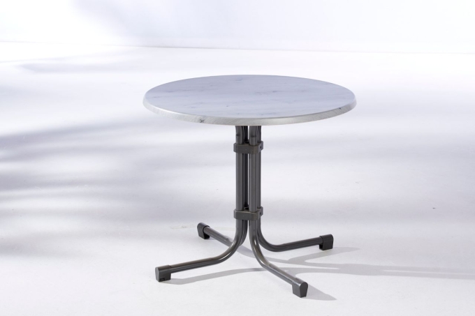 Die extrem strapazierfähige Werzalit-Tischplatte ist absolut wetterfest und pflegeleicht. Sie hat keine Kanten und Fugen. Die Platte ist kratzfest, hitzebeständig und belastbar. Das stabile und standfeste Stahlrohrgestell mit doppeltem Klappmechanismus und Sicherheitsbügel ist anthrazit pulverbeschichtet. Mit wenigen Handgriffen wird die Platte abgeklappt und das Fußgestell einfach seitlich eingeschwenkt. Dank der Niveauausgleichsschraube kann die optimale Standfestigkeit auf unebenem Boden eingestellt werden. rund 80 cm Ø / Tischhöhe: 72 cm