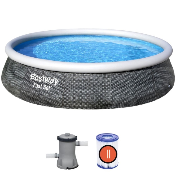 Der hochwertige Ø 396 cm Fast Set™ Familien Pool ist kinderleicht in 10 Minuten ohne Werkzeug aufgebaut. Der Pool wird inklusive Filterpumpe und dazugehöriger Filterkartusche geliefert. Die Pumpe leistet 2.006 L/h. Die extradicke 3-lagige Seitenwand besteht aus verstärktem Gewebematerial, sorgt für hohe Stabilität und hält auch hohen Beanspruchungen stand. Wählen Sie einfach einen geeigneten Platz aus und pumpen Sie den Luftring auf. Der Pool ist so konzipiert, dass er sich beim Befüllen mit Wasser automatisch aufstellt. Zum Entleeren können Sie das Abflussventil einfach an einen Wasserschlauch anschließen und so das abfließende Wasser direkt in den Garten leiten.   Produktvorteile: * inkl. Filterpumpe mit 2.006 L/h Pumpleistung * inkl. Filterkartusche * robustes, reißfestes Material * keine scharfen Ecken oder Kanten * selbstaufstellend beim Befüllen * inkl. Reparaturset: Reparaturset ist auf dem Beipackzettel fixiert. Bitte den Beipackzettel aufbewahren. * schnell aufbaubar - zu Saisonende wieder leicht zu verpacken Hinweis: * Achtung: Nicht für Kinder unter 6 Jahren geeignet * Achtung: Nur für den Hausgebrauch * Achtung: Benutzung unter unmittelbarer Aufsicht von Erwachsenen * Achtung: Nur zur Verwendung im Freien Technische Daten: * Maße (ØxH): 396 x 84 cm * Material-Bespannung: 3-lagiges TriTech™ - PVC - Polyestergewebe - PVC - Laminat * Wasserkapazität: 7.340 Liter bei 80% Füllung * Flowclear™ Filterpumpe (58383): Umwälzung 2.006 L/h * Spannung: 220-240 V / 50Hz / 40 Watt * Filterkartusche II: #58094 * Gewicht: 17,4 kg * Farbe: Grau Lieferumfang: * 1 x Bestway Fast Set Pool * 1 x Bestway Filterpumpe mit Kartusche * Reparaturset   Lieferhinweis! Dieser Artikel wird per Spedition geliefert. Um eine reibungslose Lieferung zu gewährleisten, benötigen wir Ihre Telefonnummer. Erst dann kann die Spedition mit Ihnen einen passenden Liefertermin abstimmen. Falls Sie telefonisch nicht erreichbar sind, wird die Ware an uns retourniert. Stellen Sie daher bitte sicher, dass eine aktuelle Telefonnummer übermittelt wird. Vielen Dank. Die Lieferzeit bei Speditionsartikeln beträgt zwischen 10 – 12 Werktagen.