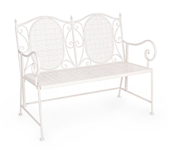 Filigrane Sitzbank Emily aus Metall mit geschwungenen Elementen und feinen Details. Das klassische französische Design lässt sich wunderbar mit vielen Einrichtungsstilen kombinieren und auch als Einzelstück ist diese traumhafte Sitzbank von Bizzotto ein echter Eyecatcher.