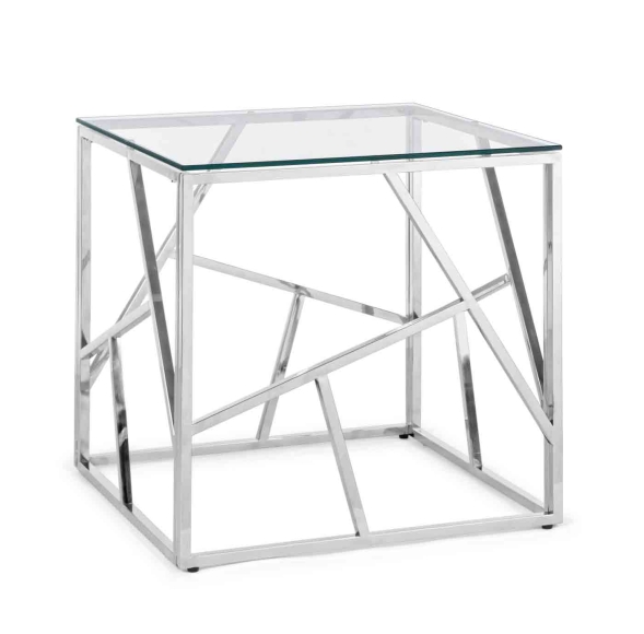 Der Beistelltisch Rayan wurde aus einem Gestell aus Edelstahl gefertigt welches einen silbernen Farbton besitzt. Die Tischplatte ist aus gehärtetem Glas mit einer Dicke von 8 Millimetern. Die Kombination aus Edelstahl und Glas verleiht dem Beistelltisch sein modernes Design