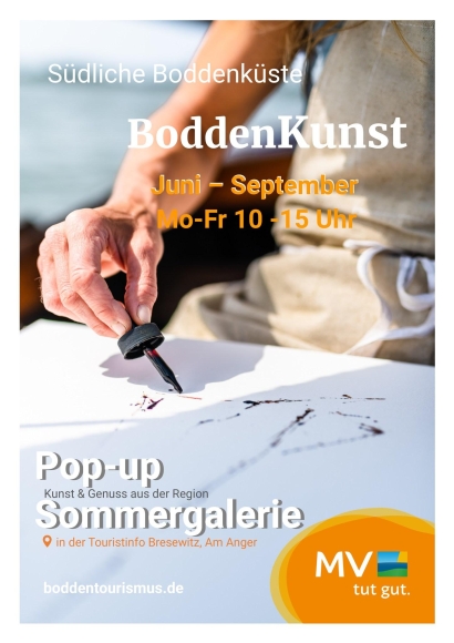 In den angrenzenden Räumen der Touristinfo präsentieren Künstler:innen und Produzent:innen, die an der südlichen Boddenküste ansässig sind, ihre Werke und Produkte – zum Anschauen, Anfassen, Kosten und zum Erwerb an einem „ungewöhnlichen“ Ort. Offen ist, an welchem Ort die Sommergalerie 2026 an der Südlichen Boddenküste ihre Türen öffnet, sicher ist aber schon, dass das BoddenKunst-Format seine Fortsetzung erleben wird.