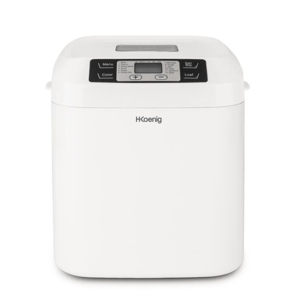 Frisches, selbstgebackenes Brot Mit dem BAKE320 von H.Koenig können Sie zu Hause köstliches und originelles Brot backen Wählen Sie aus 12 verschiedenen Programmen: klassisches Brot, Vollkornbrot, glutenfreies Brot, Brioche, Brot rapide, Kuchen, Marmelade und vieles mehrautres. Ob weiß, goldbraun oder durchgebacken, Sie bestimmen die Backstufe Ihres Brotes und auch die Größe (650 Gramm oder 800 Gramm). Mit dem intuitiven LCD-Bildschirm wird das Backen Ihres eigenen Brotes zum Kinderspiel. Der abnehmbare, antihaftbeschichtete Behälter lässt sich leicht reinigen. BAKE320 von H.Koenig, der Genuss von frischem Brot, das zu Hause hergestellt wird!Eigenschaften2 Brotgrößen: 650 g oder 800 g12 ProgrammeGlutenfreies ProgrammHerausnehmbare, antihaftbeschichtete SchüsselLCD-BildschirmStartaufschub-FunktionWarmhalten für 60 Min.3 Backstufen: Weiß, goldbraun und durchgebackenZubehör: Löffel, MessbecherLeistung: 550 W