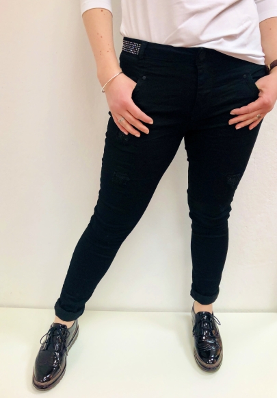 Mit Strass Steinen verzierte Stretch Jeans ist in den Größen XS-XL erhältlich. In der Farbe schwarz lässt Sie sich vielseitig kombinieren und sehr angenehm tragen. Der Hohe Stretch und Polyester Anteil sorgt für mehr Bequemlichkeit und einen optimalen Sitz.