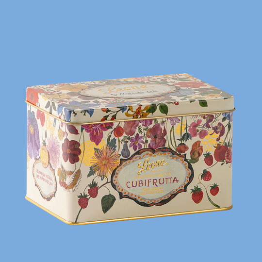 Seit 1857 steht Pastiglie Leone für fabelhafte Köstlichkeiten. Luigi Leone kreierte zuerst mit zartbunten Pastillen (pastiglie) in Turin ein wahrlich süßes Bonbon-Universum, das sich mit traditionellem, handwerklichem Können, besten natürlichen Zutaten und unvergleichlich fruchtigem Geschmack längst weltweit einen Namen gemacht hat. In dieser besonderen Metalldose verstecken sich sortierte Fruchtgelees mit intensiver natürlicher Fruchtnote. Die Weichheit der Cubifrutta-Fruchtgummis und ihr Aroma werden dabei durch einen hohen Anteil an Fruchtfleisch (20 %) und durch die sorgfältige Auswahl ätherischer Öle und Aromen erreicht. Die pastelligen Farben stammen ausschließlich vom Fruchtfleisch und von Zutaten natürlichen Ursprungs, ohne Zusatz von chemisch-synthetischen Farbstoffen. Das auffällige Design entwarf die bekannte Pariser Künstlerin Nathalie Lété, deren farbenfrohe, naive, poetische und manchmal bizarre Welt auf den authentischen Leone-Geschmack trifft. Eine lebhaft-sinnliche Paarung und ein frühlingshafter Verschenk-Favorit für die/den Liebste/n. Dose in limitierter Auflage der Künstlerin.