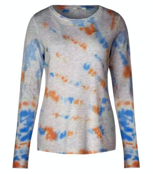 Der Damen Pullover von Cecil überzeugt durch seinen leichten Stoff und einem schönen Print in Batik-Optik. Zeigen Sie ihre kreative Seite und bereichern Sie ihren Kleiderschrank mit diesem Schmuckstück.Details+ Farbe: grau, Artwork in orange und blau+ bequem und etwas kürzer geschnitten+ Rundhalsausschnitt mit Rippbündchen+ Rollsaum an den Ärmeln+ elastisches Rippbündchen am unteren SaumMaterial72% Viskose28% Polyamid