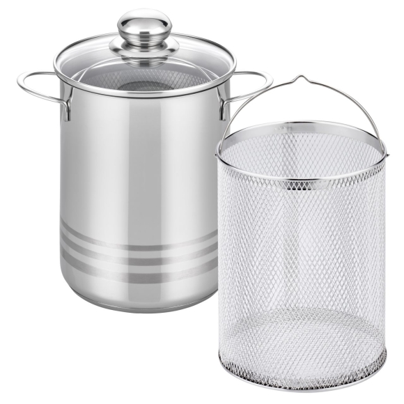 Glanzvoll elegant - einfach Brillant!Hot-dog-Party? Spaghetti-Plausch? Spargel-Feier? Oder einfach nur viel Hunger? Für alle Zutaten, die in Wasser oder Flüssigkeit gegart werden und danach ganz einfach mit dem Drahtkorb herausgehoben werden können - ohne mühseliges "Herausfischen". Aber auch für alle, die Gemüse feiern, denn sie können den Drahteinsatz wie einen Dünster verwenden und vitaminschonend Garen! Der Topf ist spülmaschinengeeignet und Backofenfest bis 180 °C mit Glasdeckel. Das vielseitige Kochgeschirr kann auf allen Herdarten inklusive Induktionsfeldern verwendet werden. Durchmesser 16 cm, Höhe 21 cm, Volumen 4 Liter