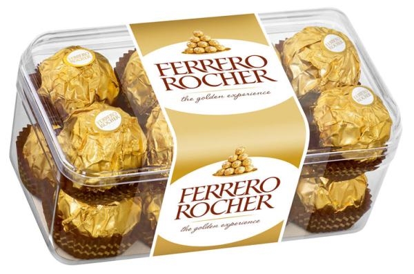 Ferrero Rocher, 16 Stück, 200g   Netto Füllmenge Bruttogewicht: 278 Gramm Nettogehalt: 200 Gramm Allergene Enthält ­ Ist im Produkt enthalten: Sojabohnen und ­erzeugnisse, Milch und Milcherzeugnisse, Nüsse und Nusserzeugnisse. Kann Mandeln, Haselnüsse, Walnüsse, Cashewnüsse etc. einschliessen, Glutenhaltiges Getreide sowie daraus hergestellte Erzeugnisse Aufbewahrung  Kühl und trocken aufbewahren Zutaten MILCHSCHOKOLADE 30 % (Zucker, Kakaobutter, Kakaomasse, MAGERMILCHPULVER, BUTTERREINFETT, Emulgator: Lecithine (SOJA)? Vanillin), HASELNÜSSE (28,5 %), Zucker, Palmöl, WEIZENMEHL, SÜSSMOLKENPULVER, fettarmer Kakao, Emulgator: Lecithine (SOJA), Backtriebmittel (Natriumhydrogencarbonat), Salz, Vanillin Nährwerte pro 100g Energie Ungefährer Wert (~) 603 Kilokalorie Energie Ungefährer Wert (~) 2506 Kilojoule Fett Ungefährer Wert (~) 42,7 Gramm davon gesättigte Fettsäuren Ungefährer Wert (~) 14,1 Gramm Kohlenhydrate Ungefährer Wert (~) 44,4 Gramm davon Zucker Ungefährer Wert (~) 39,9 Gramm Eiweiß Ungefährer Wert (~) 8,2 Gramm Salz Ungefährer Wert (~) 0,153 Gramm Marke Ferrero  Hersteller Adresse: A­6020 Innsbruck Name: Ferrero Österreich Handelsges.m.b.H.