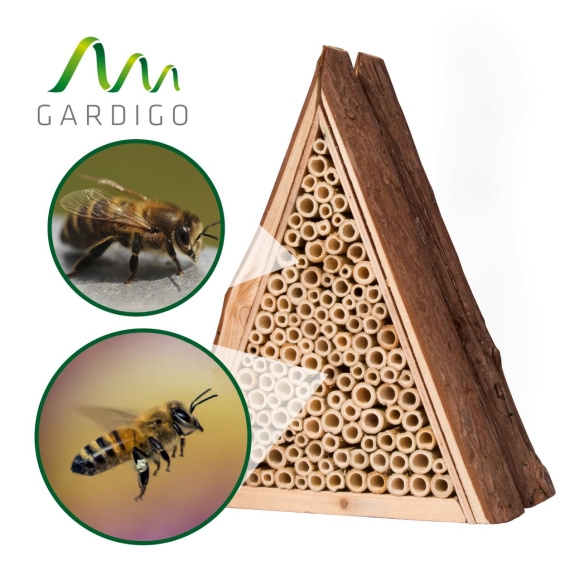 Mit den ersten warmen Sonnenstrahlen kommen wieder Bienen in den Garten. Sie fliegen umher auf der Suche nach einem zu Hause zum Nisten und Überwintern und das Gardigo Bienenhotel bietet dazu einen schönen Platz zum Wohlfühlen. Stellen oder hängen Sie das Bienenhotel im Frühjahr oder Sommer an einem geschützten, sonnigen Platz in Ihrem Garten oder Terrasse und in der Nähe von Bäumen oder Sträuchern auf. Nach und nach können sich verschiedene Bienen in dem Haus niederlassen und einrichten. Bienen legen Ihre Eier bevorzugt in die Röhren aus Holz und verschließen diese im Anschluss, bis die fertigen Bienen sich im Frühjahr den Weg ins Freie bahnen. Bienen sind ab April aktiv und bestäuben Stein- und Kernobst sowie Erdbeeren. Nahrung finden sie in der nahen Umgebung im Garten, an Sträuchern und Blüten. Das Haus dient den Bienen als Nist- und Überwinterungshilfe. Man kann wunderbar das Treiben der Insekten beobachten, was gerade für Kinder ein tolles Erlebnis ist.Anwendung:1. Hängen Sie das Bienenhotel an einem vor Wind- und Regen geschützten aber sonnigen Platz auf.2. Die Frontseite des Hauses sollte idealerweise in südliche Richtung zeigen.3. Bitte lassen Sie das Haus auch im Winter hängen, Wild-Bienen nisten und überwintern darin.4. Das Bienenhotel bitte nicht anstreichen oder lackieren, in diesem Fall würden sich Bienen nicht einnisten.