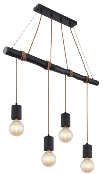 Hängeleuchte Metall schwarz, Holz schwarz, Aluminium schwarz, Kabel Textil champagner, Fassungsabdeckung gerillt, LxBxH: 900x70x1200mm, exkl. 4x E27 60W 230V