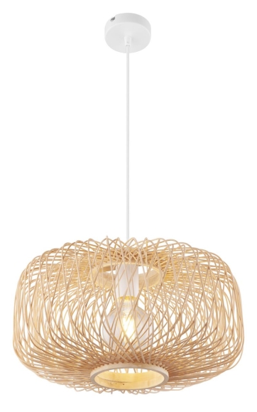 Die Hängleuchte LUCIA (Ø 40cm) überzeugt durch ihr natürliches Aussehen. Die aus weißem Metall und naturfärbigem Bambus bestehende Leuchte punktet durch ihren linienförmig angeordneten Lampenschirm. Dank der E27 Fassung ist eine freie Leuchtmittelwahl bis 25 Watt möglich.