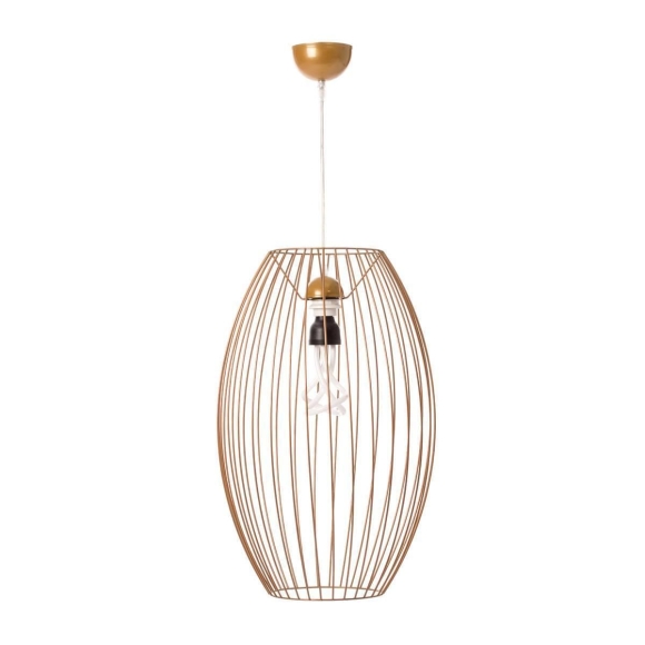 **Stilvolle Deckenlampe in minimalistischem Design**Wenn Sie in Ihrer Umgebung neue Akzente setzen möchten, dann sind Sie mit dieser Deckenlampe gut beraten. Die Lampe gibt sich in industriellem, minimalistisch gehaltenen Design. Das Gestell des Lampenschirms aus beschichtetem Draht wurde stilvoll in Form gebracht. Gleichmäßige Abstände zwischen den einzelnen Drahtsträngen sorgen für ein harmonisches Gesamtbild und integrieren die ansonsten schlichte Lampe optimal in Ihre Wohneinrichtung. Durch den außergewöhnlichen Lampenschirm ergeben sich bei eingeschaltetem Licht tolle Strahleneffekte, die dem Raum eine bezaubernde Atmosphäre verleihen.Doch egal, ob die goldene Lampe ein- oder ausgeschaltet ist – sie ist jederzeit dekorativ und trendig.Die Deckenlampe ist in verschiedenen dezenten Farben, wie Schwarz, Weiß, Gold oder Silber, sowie unter anderen Namen in verschiedenen attraktiven und zum Teil außergewöhnlichen Formen erhältlich. Jede Form hat dabei ihren ganz eigenen Charakter, der sich auch auf den Raum überträgt. In unserem Sortiment ist für jeden Geschmack und jeden Anspruch die passende Form dabei. Ob flach mit einer geringen Höhe von ca. 25 cm oder länglich und schmal mit ca. 60 cm Höhe für höhere Räume – schauen Sie sich unsere verschiedenen Hängelampen der Serie an. Metallteile zur Aufhängung und ein farblich passendes Kunststoffkabel von ca. 80 cm Länge komplettieren das Produkt.Bestellen Sie Ihre Lieblingsvariante als Einzelstück oder auch eine Kombination verschiedener Varianten. Entwickeln Sie mit diesen Lampen eine individuelle Raumbeleuchtungs-Komposition, die Ihr persönliches Einrichtungs-Konzept hervorragend ergänzt. Setzen Sie zum Beispiel Ihre Bilder und Gemälde mit der attraktiven Lampe gekonnt in Szene oder machen Sie es sich im Schein der Lampe auf einem bequemen Sitzkissen gemütlich.Der Lampenschirm ist unten geöffnet, sodass Leuchtmittel ganz einfach getauscht werden können. Benötigt werden E27-Leuchtmittel mit max. 40 Watt, die im Lieferumfang nicht enthalten sind.