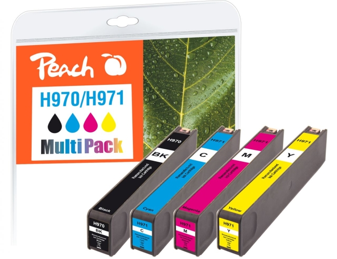 100% Neuer Chip inkl. Tintenstandsanzeige.1 x Peach Tintenpatrone schwarz kompatibel zu HP No. 970 bk, CN621A1 x Peach Tintenpatrone cyan kompatibel zu HP No. 971 c, CN622A1 x Peach Tintenpatrone magenta kompatibel zu HP No. 971 m, CN623A1 x Peach Tintenpatrone gelb kompatibel zu HP No. 971 y, CN624APeach ist eine führende Schweizer Marke für kompatible Tintenpatronen. Spitzentechnologie gewährleistet höchste Qualität und führt zu herrvoragenden Ergebnissen. Farb- und Lichtechtheit entsprechen höchsten Anforderungen und gewährleisten brillante Druckresultate. Um die Premium Qualität sicherzustellen, wird die Tinte im eigenen Entwicklungszentrum in der Schweiz entwickelt und anschliessend in unseren Fertigungsstandorten in die Tintenpatronen abgefüllt. Produktion und Fertigung entsprechen neusten Erkenntnissen aus Lehre und Forschung. Qualität, mit der asiatische Hersteller nicht gleichziehen können und dies zu immer noch sehr attraktiven Preisen. Eine echte Alternative zu teuren Original Produkten oder Billigsttinten.