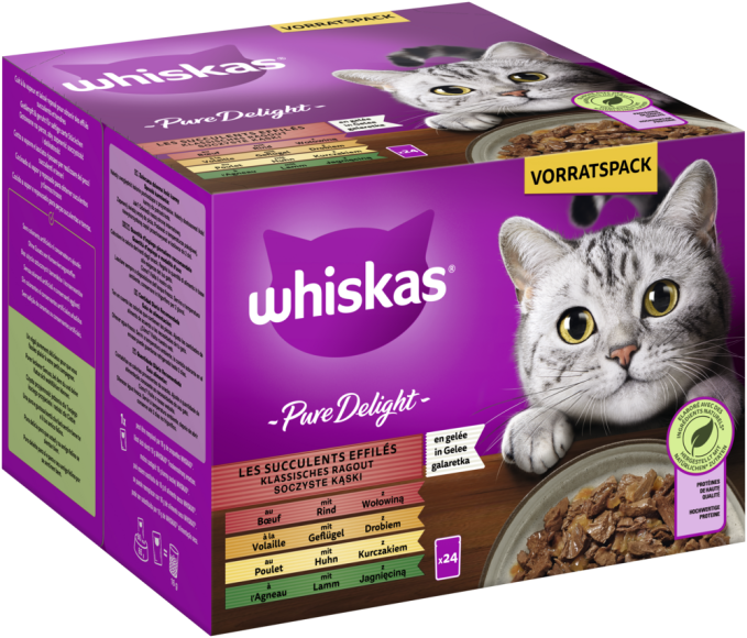 WHISKAS® PURE DELIGHT Portionsbeutel Multipack Vorteilspack Klassisches Ragout in Gelee mit Rind, mit Huhn, mit Lamm, mit Geflügel 24 x 85gAls Katzenliebhaber wissen wir, dass Schnurren das schönste Geräusch ist, das man hören kann. Deshalb kreieren wir mit großer Leidenschaft köstliche Mahlzeiten, die Katzen auf der ganzen Welt dazu bringen, mit schnurrender Begeisterung zu ihren Näpfen zu eilen. Jedes Gericht wird mit Liebe und Sorgfalt zubereitet und ist ernährungsphysiologisch ausgewogen, um dabei zu helfen, dass deine Katze alles hat, was sie braucht, um bei den Mahlzeiten zu schnurren – und nicht nur dann.Adult-Katzenfutter in Gelee, das auf die Bedürfnisse deiner ausgewachsenen Katze abgestimmt ist. Köstlicher Katzenfutter-Mix. In 85g-Beuteln. Jedes köstliche Stückchen wird im eigenen Saft gegart, um die köstliche natürliche Flüssigkeit einzuschließen, dann gedämpft und ruhen gelassen, um saftige, zarte Stücke zu erhalten, die deine Katze vor Aufregung schnurren lassen. Hergestellt mit natürlichen* Zutaten und hochwertigem Protein, ohne künstliche Farb- und Konservierungsstoffe für puren, leckeren Genuss. Hergestellt mit hochwertigem Protein, ohne künstliche Farb- oder Konservierungsstoffe – für puren Genuss. Jede Rezeptur wird gegart, um die köstliche natürliche Flüssigkeit einzuschließen, und dann schonend gedämpft und geruht für saftige zarte Stückchen, die deine Katze lieben wird. Deckt 100% des täglichen Bedarfs deiner Katze. Jedes Rezept enthält alle Nährstoffe, Vitamine und Mineralstoffe, die benötigt werden, um deine Katze glücklich und gesund zu halten. Entwickelt mit unseren Ernährungswissenschaftlern und Tierärzten unseres WALTHAM Petcare Science Institute. Wir sind bestrebt, unsere Umweltauswirkungen zu verringern. 85% unserer Fabriken in Europa nutzen Strom aus erneuerbaren Energien, und wir arbeiten daran, dies bis 2025 auf 100% zu erhöhen.Fütterungsempfehlung:1 Portionsbeutel lässt sich durch 16 g WHISKAS® Trockennahrung ersetzen. Berücksichtigen Sie die Kalorien, die von Snacks stammen. Passen Sie die Fütterungsmenge den Bedürfnissen Ihrer Katze an. Wie Besuchen Sie unsere Website. Stellen Sie frisches Trinkwasser bereit. Bitte bei Zimmertemperatur servieren. Bitte beachten Sie die Fütterungstabelle auf der Verpackung für eine individuelle Anpassung für Ihr Tier.Zusammensetzung:Fleisch und tierische Nebenerzeugnisse (20%, 97% natürlich*; u.a. Rind 4% im Häppchen**), pflanzliche Eiweissextrakte, Mineralstoffe (0.7%), Zucker, pflanzliche Nebenerzeugnisse. *Natürliche Zutaten. **Häppchen machen 33% des Produkts aus. # mit Huhn - Zusammensetzung: Fleisch und tierische Nebenerzeugnisse (21%, 100% natürlich*; u.a. Huhn 4% im Häppchen**), pflanzliche Eiweissextrakte, Mineralstoffe (0.7%), Zucker, pflanzliche Nebenerzeugnisse. *Natürliche Zutaten. **Häppchen machen 33% des Produkts aus. # mit Lamm - Zusammensetzung: Fleisch und tierische Nebenerzeugnisse (20%, 97% natürlich*; u.a. Lamm 4% im Häppchen**), pflanzliche Eiweissextrakte, Mineralstoffe (0.7%), Zucker, pflanzliche Nebenerzeugnisse. *Natürliche Zutaten. **Häppchen machen 33% des Produkts aus. # mit Geflügel - Zusammensetzung: Fleisch und tierische Nebenerzeugnisse (21%, 100% natürlich*; u.a. Geflügel 4% im Häppchen**), pflanzliche Eiweissextrakte, Mineralstoffe (0.7%), Zucker, pflanzliche Nebenerzeugnisse. *Natürliche Zutaten. **Häppchen machen 33% des Produkts aus.Analytische Bestandteile:Protein: 11.7; Fettgehalt: 2.2; anorganischer Stoff: 1.2; Rohfaser: 0.20; Feuchtigkeit: 84.0. Brennwert: 60 kcal/85 g.Zusatzstoffe:Ernährungsphysiologische Zusatzstoffe: Vitamin B1: 27.7 mg, Vitamin D3: 189 IE, Vitamin E: 18.5 mg, Taurin: 640 mg, Kupfer (Kupfer(II)-sulfat-Pentahydrat): 1.4 mg, Jod (Calciumjodat wasserfrei): 0.33 mg, Eisen (Eisen-(II)-sulfat-Monohydrat): 16.5 mg, Mangan (Mangan(II)-sulfat, Monohydrat): 3.3 mg, Zink (Zinksulfat Monohydrat): 21.1 mg / Technologische Zusatzstoffe: Cassia-Gum: 2312 mg.