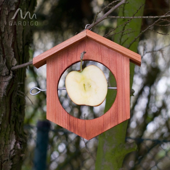 Jedes Jahr aufs Neue kommt der Winter und das Futter für Vögel wird rar. Die Vögel, die in unserer Region bleiben und uns auch im Winter beglücken, haben Hunger und benötigen Vitamine. Die Gardigo Apfel-Futterstation aus Holz mit Metallspieß ist eine dekorative Halterung für äpfel, Birnen, Meisenknödel oder ähnlichem. Sie sollte rechtzeitig zum ersten Schneefall aufgehängt werden. Zu diesem Zeitpunkt suchen sich Vögel ihre Futterstellen und bleiben ihr treu. Die Futterstation sollte möglichst geschützt aufgehängt werden, damit das Futter und die Tiere der Witterung nicht voll ausgesetzt sind. Erfreuen Sie sich an den Vögeln in Ihrem Garten, durch die Gardigo Apfel-Futterstation.Maße 18 x 18,5 x 4 cmFarbe Braun (div. Naturmaterialien)Lieferumfang 1 Apfel-Futterstation