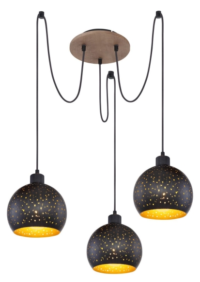 Die moderne Hängeleuchte „ADAJA“ überzeugt durch ihre ausgefallenen Metallschirme in schwarz-matt und goldfarben sowie kleinen runden Stanzungen in den Schirmen, sodass der goldfarbene Innenteil besonders gut zur Geltung kommt (H: 225cm, DM: 20cm). Ein weiterer Hingucker ist die hölzerne Deckenhalterung. Die drei vorhandenen E27 Fassungen können Sie je nach eigenem Wunsch mit Leuchtmitteln Ihrer Wahl bestücken und so selbst entscheiden welche Lichtfarbe und auch Lichtstärke perfekt für Sie geeignet ist (max. 40 Watt). Außerdem können Sie die Leuchte noch mit weiteren tollen Modellen dieser Serie ergänzen.