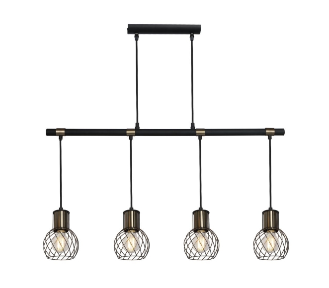 Die Hängeleuchte (LxBxH 87x12x120cm) der Serie Argusto besticht durch eine Kombination aus modernen Elementen und Retrolook. Der Artikel ist in schwarz matt und goldenen Akzenten gehalten, der Schirm besteht aus einem geschwungenen Drahtgeflecht. Die 4 verbauten E27 Fassungen sind bis maximal 40W ausgelegt und erlauben sowohl dimmbare als auch nicht dimmbare Leuchtmittel sowie Leuchtmitteltausch.