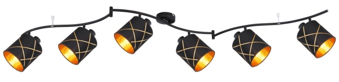 Strahler Metall schwarz matt, Textil schwarz, Acryl goldfarben, beweglich, LxBxH: 1770x130x202mm, exkl. 6x E27 25W 230V