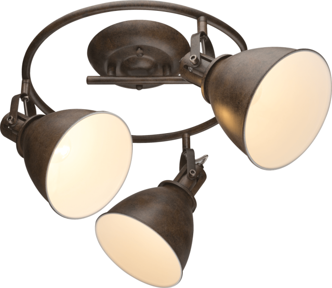 Drei bewegliche rostfärbige Metallstrahler, an der Innenseite in weißem Farbton, sind bei der Deckenlampe Giorgio formschön an einer e-förmigen Schiene befestigt. Die Innenleuchte (Ø 330mm) bietet mit ihren drei E14 Fassungen die Möglichkeit das Leuchtmittel Ihrer Wahl (max. 40W) zu nutzen, um dadurch auch die Helligkeit selbst zu bestimmen. Aufgrund ihrer Stromersparnis und Langlebigkeit empfehlen wir LED-Leuchtmittel.