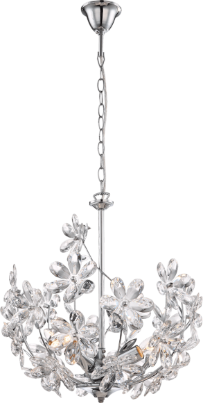 Durch die verspielte Art dieser Hängelampe wird sie zu einem wahren Hingucker. Gekonnt eingesetzt, kann die verchromte Lampe mit klaren Acrylkristallen, in Form von Blüten, zu einem wahren Highlight werden. Mit einem Durchmesser von 41 cm ragt sie 135 cm in den Raum. Die drei E14 Fassungen überlassen Ihnen die Möglichkeit selbst ein Leuchtmittel (max. 40W) zu verwenden.