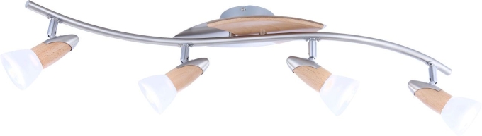 Dieser schlichte Strahler in nickel matt und Holz Optik kann praktisch in jedem Raum platziert werden. Einfache Montage und hochwertige Verarbeitung sind nur zwei von vielen Attributen welche diesen Artikel beschreiben. Um die vier E14 Fassungen befinden sich satinierte Glasschirme welche der Lampe einen schönen Touch verleihen. Durch die Fassungen haben Sie die Möglichkeit selbst ein Leuchtmittel (max. 40W) ihrer Wahl zu benutzen und aufgrund ihrer Langlebigkeit und Stromersparnis empfehlenwir LED-Lampen