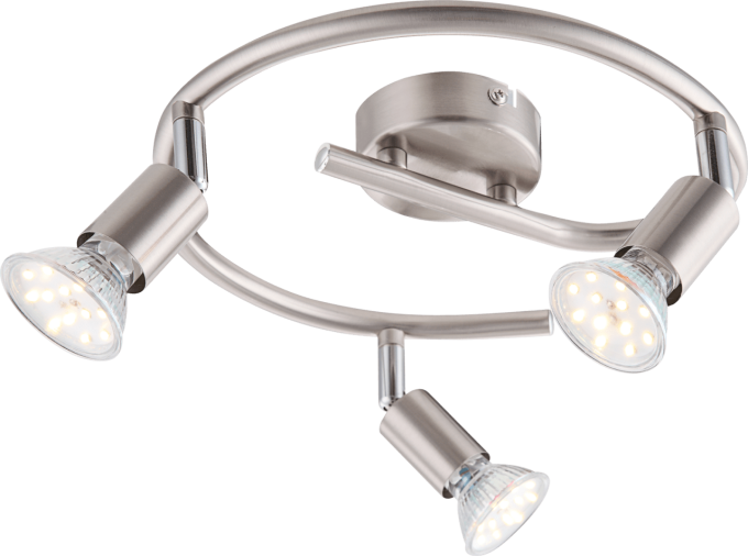 Auch dieser Strahler aus der Serie Matrix wirkt durch sein Design zeitlos und vielseitig einsetzbar. Alle Bestandteile dieser Lampe sind verchromt und nickel matt. Der Strahler hat einen Durchmesser von 25 cm und wirkt durch die e-Form verspielt. Die ganze Lampe besteht aus insgesamt drei Strahlern die durch die LED Leuchtmittel mit GU10 Fassung 750 Lumen starkes und 3000K warmweiße Licht ausstrahlen, welches sich sehr gut mit den anderen Bestandteilen der Lampe ausgleicht.