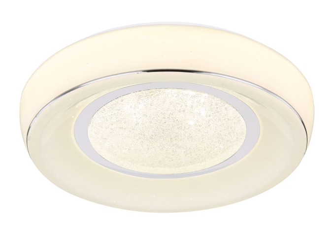 Die Deckenlampe aus der Serie Mickey lässt keine Wünsche offen. Der runde (Ø39cm) opale Lampenschirm sorgt mit den darin verfügbaren funkelnden Kunststoffkristallen für ein aufregenden Licht. Mit der inkludierten Fernbedienung können Sie einfach und bequem die Leuchte dimmen (max. 1300 Lumen) und die Lichtfarbe stufenweise von warmweißen 3000 Klevin bis zu kaltweißen 6000 Levin verstellen und fixieren.
