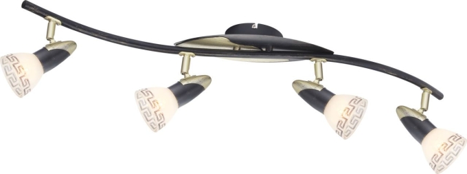 Dieser vierflammige Strahler aus der Serie Novara, lässt sich sehr gut als Zusatzbeleuchtung in einen Flur oder in einem Schlafzimmer verwenden. Außerdem können Sie die Leuchte sehr gut mit weiteren Artikel der Produktionsreihe Novara kombinieren. Die schwenkbaren Leuchtspots sind an einer 83cm langen, geschwungenen Schiene befestigt. Die metallene Lampe besitzt goldene Details und an den Leuchtschirmen befindet sich ein Muster. Die Lampe verfügt über vier E17 R50 Fassung, dadurch haben Sie die Möglichkeit die Leuchte mit einem passenden Leuchtmittel bis max. 40 Watt zu bestücken. Wir empfehlen Ihnen LED-Lampen, wegen ihrer Stromersparnis und Langlebigkeit.