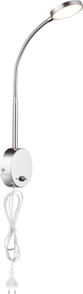 Mit dieser schlichten aber dennoch eleganten Lampe können Sie angenehme Akzente setzen. Am Ende eines verchromten Aluminumarmes befindet sich ein flacher Strahler, welcher durch satiniertes Glas ein 450 Lumen starkes und 3000K warmweißes Licht ausstrahlt. Zudem besitzt die 51 cm große Lampe ein 150 cm langes transparentes Kabel mit Stecker und Schalter.