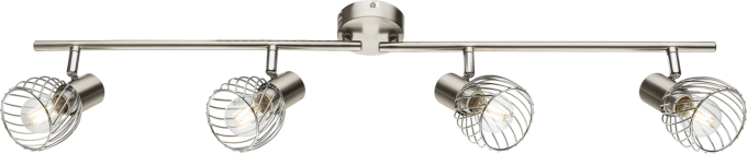 Der Deckenstrahler dieser Produktserie überzeugt durch die Kombination aus Design und Verarbeitung. Die Materialkombination aus nickelmatten Metall und Spotschirmen in Metallkäfig-Optik sorgt für das besondere Etwas. Die vier an zwei geraden Armen befestigten und beweglichen Spots sind mit jeweils einer E14 Fassung ausgestattet, die es Ihnen ermöglicht das Leuchtmittel selbst zu bestimmen (max.40W) um damit über Lichtstärke und Lichtfarbe zu entscheiden. Aufgrund ihrer Stromersparnis und Langlebigkeit empfehlen wir LED-Lampen. Mit weiteren Deckenlampen der gleichen Produktserie können Sie das Bild in Ihren Räumen komplettieren.