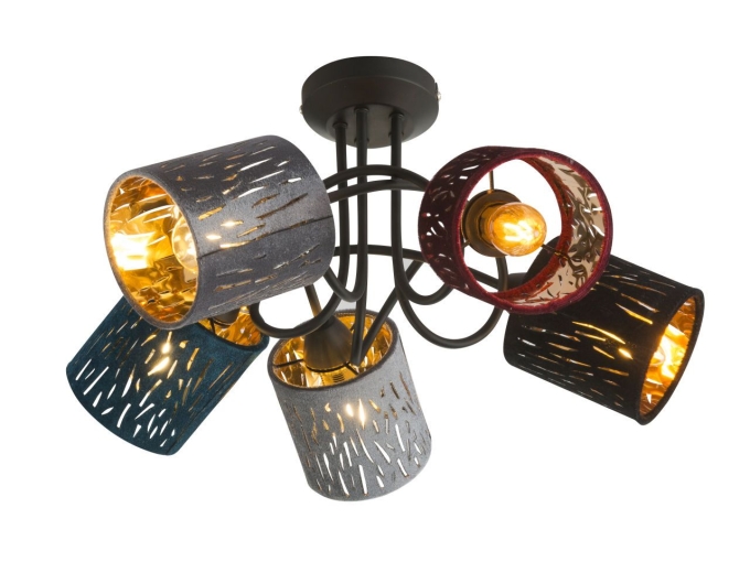 Das elegante Design der modernen und stilvollen Deckenleuchte Ticon, sorgt in jedem Wohnraum für ein harmonisches Flair. Die Leuchtschirme selbst besitzen harmonisch aufeinander abgestimmte Farben, die auch im ausgeschalteten Zustand sehr elegant erscheinen. Die Schirme sind mit einem Samtstoff überzogen und besitzen Dekorstanzungen. Durch diese wird das Licht atemberaubend reflektiert. Die fünf Leuchtschirme sind an einer optisch verknoteten Deckenhalterung (ø46cm) angebracht. Die Deckenleuchte verfügt über fünf E14-Fassungen, dadurch haben Sie die Möglichkeit die Leuchtmittel (25Watt) frei auszuwählen, je nachdem welche Lichtstärke und Lichtfarbe Sie gerne hätten. Wir empfehlen Ihnen LED-Lampen, wegen ihrer Langlebigkeit und Energieersparnis. Diese Deckenleuchte lässt sich wunderbar in ein Schlafzimmer intergieren und passt zu vielen Einrichtungsstilen.