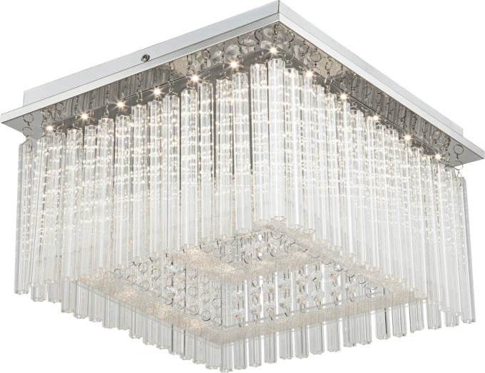 Diese auffällige, quadratische Deckenlampe, aus der Serie Joyce, zeichnet sich durch ihr stilvolles Design, sowie durch ihre hochwertige Verarbeitung aus. Diese Lampe ist mit Chrom überzogen und besitzt klare Glasstäbe, sowie klare Glaskristalle, die einen glamourösen Akzent setzen. Des Weiteren hat sie eine Größe von 36 cm, ein 1860 Lumen starkes LED-Leuchtmittel und strahlt in einer Lichtfarbe von 4000 Kelvin.