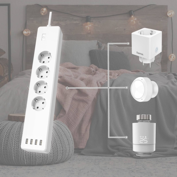 Hama WLAN-Steckdosenleiste mit 4 separat steuerbaren Anschlüssen sowie 4 USB-Anschlüssen, Überlastschutz Bis zu vier Leuchten und andere Geräte mit Stecker lassen sich über die Hama WLAN-Steckdosenleiste smart steuern. Jede der vier Steckdosen kann individuell geschaltet werden. Dies ist per WLAN mit der kostenfreien Hama Smart Home App oder mit Sprachbefehlen möglich. Eine Bridge wird hierfür nicht benötigt und das System ist mit dem Google Assistant, Amazon Alexa sowie den Siri (Shortcuts) von Apple kompatibel. Zusätzlich können weitere vier Geräte per USB-Anschluss aufgeladen werden. Die WLAN-Steckdosenleiste ist zudem mit einem erhöhten Berührungsschutz sowie einem Überlastschutz (> 10 A) ausgestattet. Darüber hinaus ist es mit dieser Smart-Home-Steckdosenleiste ebenfalls möglich, von unterwegs aus den Status jeder einzelnen Steckdose zu prüfen, und auch Timer lassen sich für eine automatisierte Steuerung einstellen. Technische Merkmale / Kompatibilität: - Einbindung via WiFi; ohne Gateway per App und mit Sprachbefehlen steuerbar - kostenlose App für iOS und Android - mit 4 individuell schaltbaren Funksteckdosen - 4 USB-Anschlüsse integriert (jeweils 5 V / 2,1 A / 10,5 W, max. USB-Gesamtstrom: 4,2 A) - maximale Gesamtleistung der versorgten Verbraucher: 2.300 Watt - Sprachsteuerung mit Amazon Alexa, Google Assistant und Apple Siri (Shortcuts) möglich - kompatibel mit der Home Connect Plus App von Bosch - Überlastschutz - erhöhter Berührungsschutz - Datenspeicherung ausschließlich auf deutschen Servern